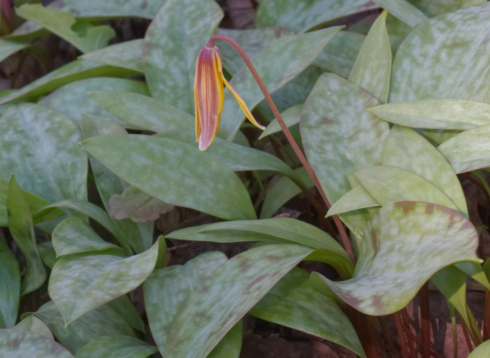 | Yellow Trout Lily The mottled leaves are the basis for the "trout" name. The flower is closed because of the low temperature. |